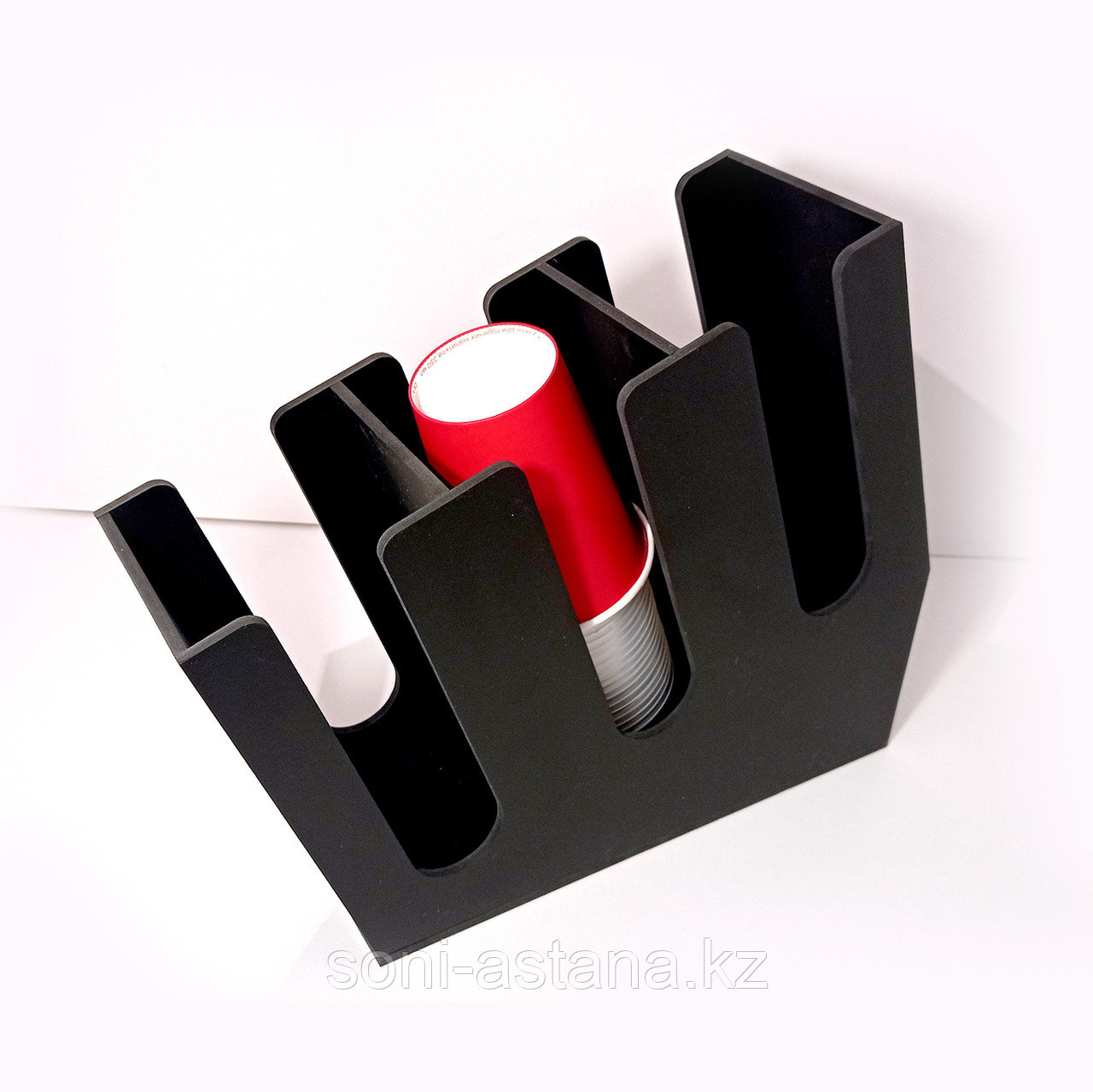 Удобный Диспенсер для стаканчиков и крышек диаметром до 94 мм. Изготовлен из черного пластика, его можно протирать влажной салфеткой.
